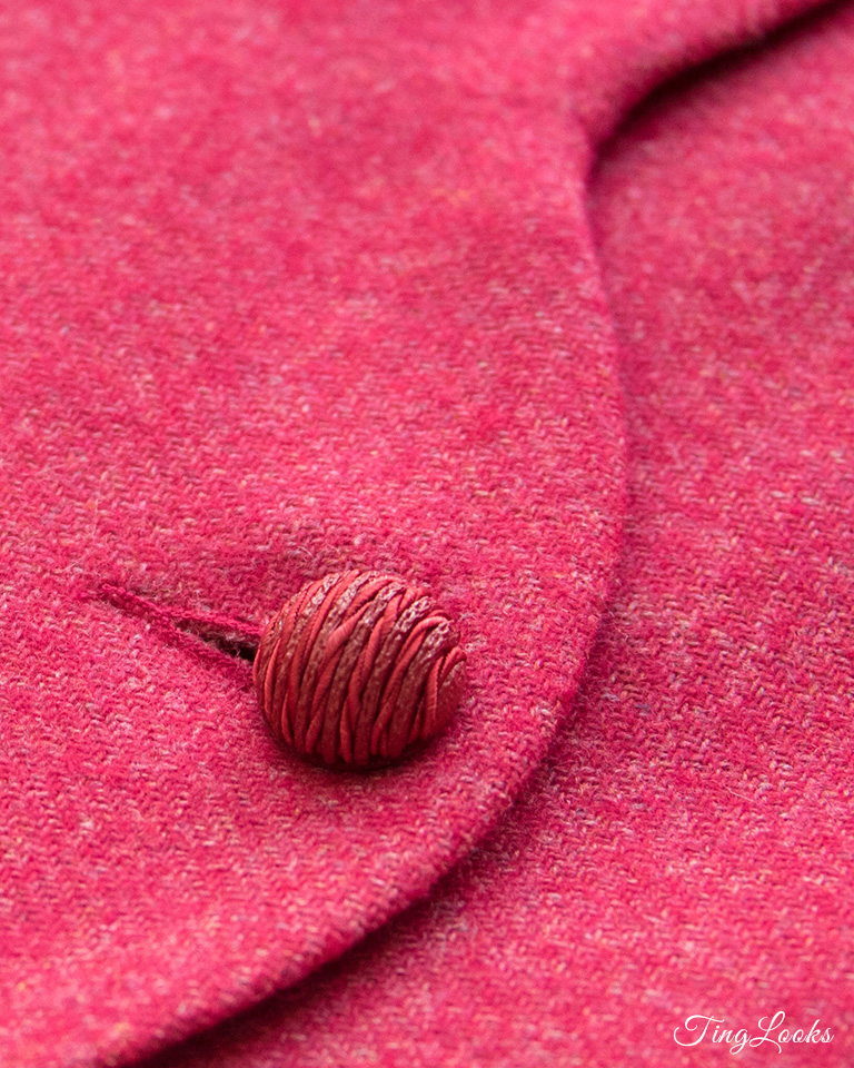 A wrap skirt with petal curved opening cut by tweed wool and the button details match the texture of the fabric